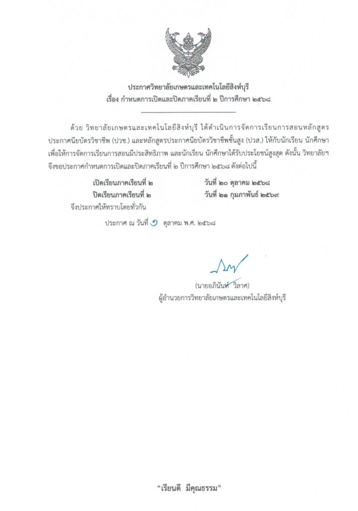 ประกาศ วิทยาลัยเกษตรและเทคโนโลยีสิงห์บุรี